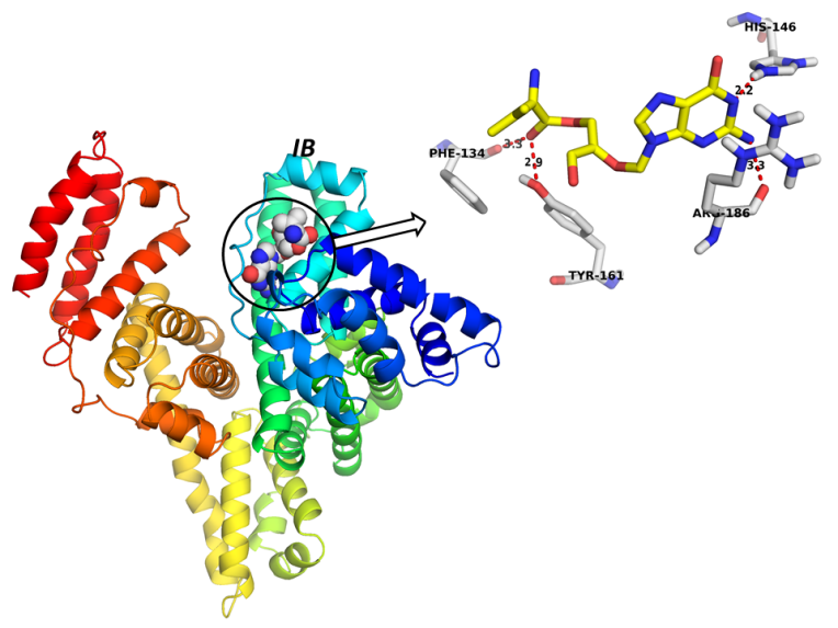 Molecular modelling studies were performed using autodock 4.2 program using a lamarckian genetic algorithm. HSA X-ray crystal structure is taken from brookhaven protein data bank (PDB ID: 1AO6) and the protein topology was prepared using autodock 4.2. PBD structure of valganciclovir is obtained from https://www. drugbank.ca/drugs/DB01610 and is used without further modifications. Grid box of dimensions 126 x 126 x 126 was set with a grid spacing of 0.703 A °. And the center of the grid was set to 2.95, 3.18 and 2.35 nm. Docking parameters were set at default settings, and 25 conformations were run using a genetic algorithm. The conformer with the lowest binding energy that corresponds to the experimental value is visualized and analyzed using PyMol software.
