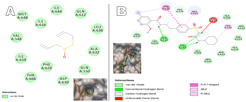 Fig. 2: Molecular docking interaction with ligand amino acid residues; A) Interaction residue SUR1-Allicin, B) Interaction residue SUR1-glibenclamide