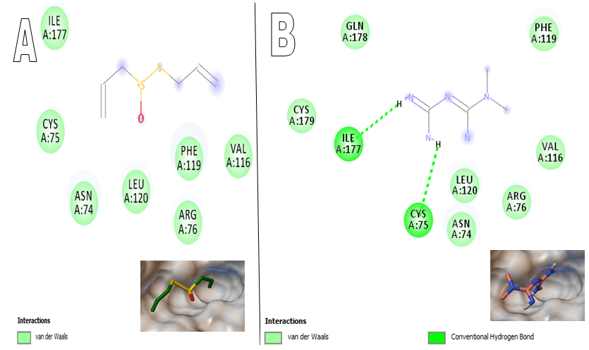 Fig. 3: Molecular docking interaction with ligand amino acid residues; A) Interaction residue complex 1-Allicin, B) Interaction residue complex 1-metformin