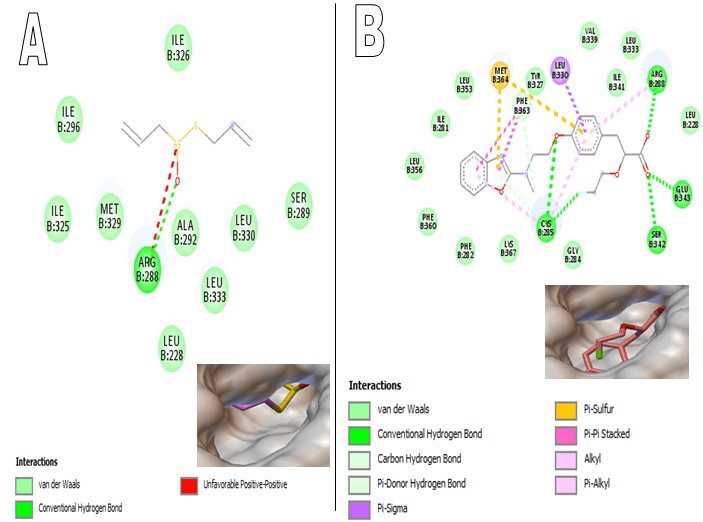 Fig. 4: Molecular docking interaction with ligand amino acid residues; A) Interaction residue PPARγ-Allicin, B) Interaction residue PPARγ–pioglitazon