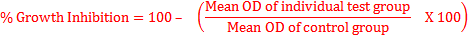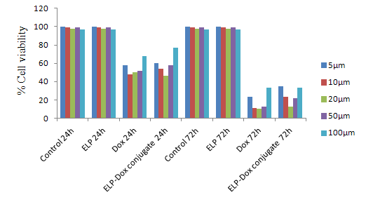 The monolayer cell culture was trypsinized and the cell count adjusted to 5000 cells/200 µl/well. After 24 h, when a partial monolayer was formed, the supernatant was flicked off and the monolayer washed with the medium. Different concentrations of Dox and the ELP-Dox conjugate (5, 10, 20 50 100 μm each) were added to microtitre plates. The plates were then incubated at 370C for 3 days in 5% CO2 atmosphere. Microscopic examination was carried out and observations were noted every 24 h. The medium was discarded and 20 µl of MTT in PBS was added to each well. The plates were further incubated for 2 h while being protected from light at room temperature to solubilize the formazan formed. The absorbance was measured using a microplate reader at the wavelength of 540 nm. The percentage growth inhibition was calculated using formula,