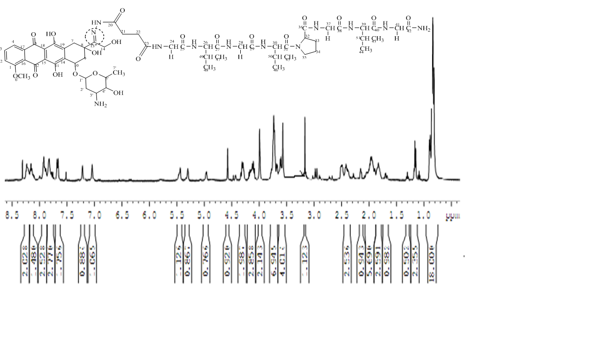 The 1HNMR data obtained are good in agreement for the structure of ELP-Dox conjugate: δ = 3.71 (d, J=8 Hz, 1H, Gly4 - α - CHa), 3.67 (d, J=8 Hz, 1H, Gly4 - α - CHb), 8.22 (t, J=4 Hz, 1H, Gly4 - α - NH), 0.80 (d, J=7.5 Hz, 3H, Val3 - γ - CH3a), 0.82 (d, J=7.5 Hz, 3H, Val3 - γ - CH3b), 1.95 (m, 1H, Val3 - β - CH), 4.28 (dd, J=8 Hz, 1H, Val3 - α - CH), 8.21 (d, J=4 Hz, 1H, Val3 - α - NH), 3.67 (d, J=8 Hz, 1H, Gly3 - α - CHa), 3.65 (d, J=8 Hz, 1H, Gly3 - α - CHb), 8.20 (t, J=4 Hz, 1H, Gly3 - α - NH), 0.83 (d, J=7.5 Hz, 3H, Val2 - γ - CH3a), 0.84 (d, J=7.5 Hz, 3H, Val2 - γ - CH3b),), 1.94 (m, 1H, Val2 - β - CH), 4.28 (dd, J=8 Hz, 1H, Val2 - α - CH), 7.91 (d, J=8 Hz, 1H, Val2 - α - NH), 4.13 (bt, J=8 Hz, 1H, Pro1 - α - CH), 1.94 (m, 2H, Pro1 - β - CH2), 1.88 (m, 2H, Pro1 - γ - CH2), 3.72 (t, J=8 Hz, 2H, Pro1 - δ - CH2), 3.67 (d, J=8 Hz, 1H, Gly2 - α - CHa), 3.65 (d, J=8 Hz, 1H, Gly2 - α - CHb), 7.89 (t, J=8 Hz, 1H, Gly2 - α - NH), 0.87 (d, J=7.5 Hz, 3H, Val1 - γ - CH3a), 0.89 (d, J=7.5 Hz, 3H, Val1 - γ - CH3b),), 1.97 (m, 1H, Val1 - β - CH), 4.28 (dd, J=8 Hz, 1H, Val1 - α - CH), 7.67 (d, J=8 Hz, 1H, Val1 - α - NH), 3.71 (d, J=8 Hz, 1H, Gly1 - α - CHa), 3.72 (d, J=8 Hz, 1H, Gly1 - α - CHb), 7.97 (t, J=8 Hz, 1H, Gly1 - α - NH), 3.60 (d, J=4 Hz, 2H, 21-H), 3.56 (d, J=4 Hz, 2H, 22-H), 7.81 (d, J=8 Hz, 1H, 4-H), 7.65 (d, J=8 Hz, 1H, 3-H), 7.67 (d, J=8 Hz, 1H, 2-H), 5.42 (s, 1H, 1´-H), 5.29 (s, 1H, 8-OH), 4.30 (s, 1H, 10-H), 4.56 (s, 1H, 5´-H), 4.13 (s, 1H, 4´-H), 3.98 (s, 1H, 1-OCH3), 3.72 (s, 1H, 3´-H), 2.42 (dd, J=16Hz, 1H, 7-eqH), 2.40 (dd, J=16Hz, 1H, 7-axH), 2.14 (m, 1H, 9-eqH), 2.37 (m, 1H, 9-axH), 1.82 (t, J=12Hz, 1H, 2´-eqH), 1.83 (t, J=12Hz, 1H, 2´-axH), 1.15 (s, 1H, 5´-CH3) (Fig. 2).