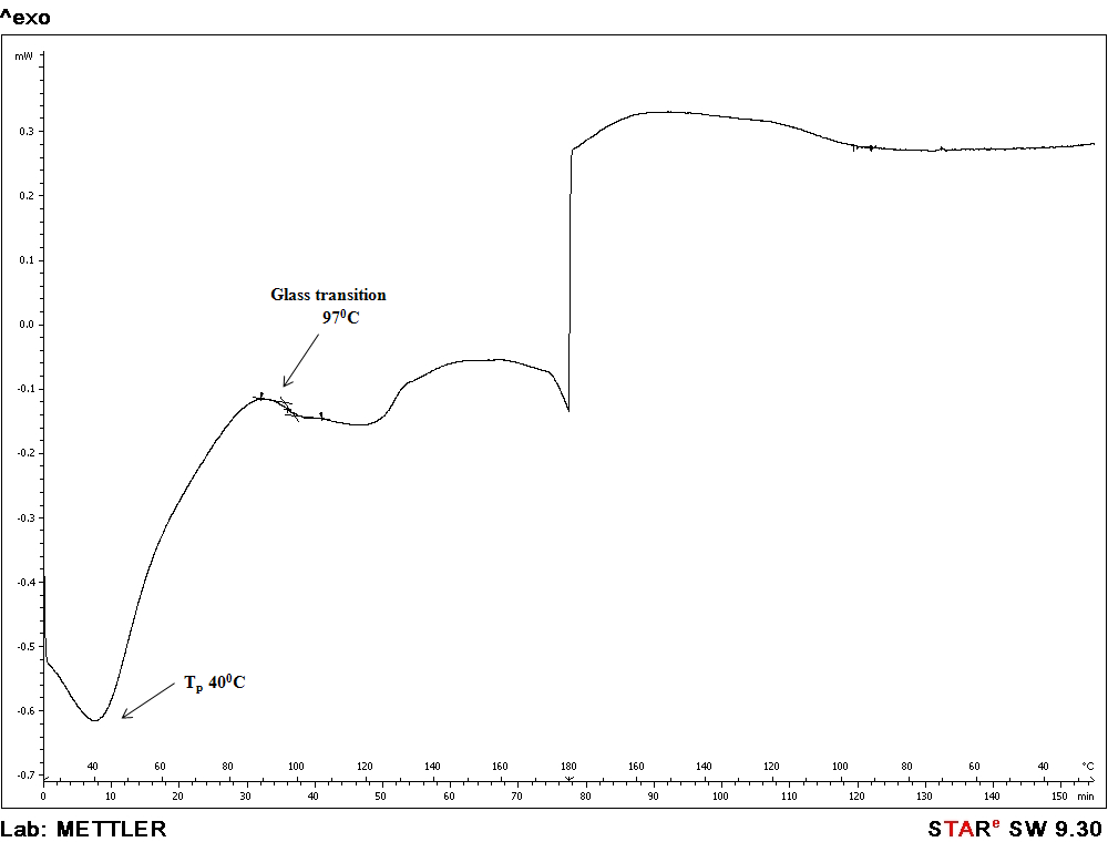 The DSC thermogram of the ELP is shown in Fig. 5. The figure indicates a clear visualization of the physical transition of the ELP. An exothermic peak near 400C observed denotes the peak temperature, Tp, which corresponds to the phase transition. The thermogram also shows a glass transition for the ELP at 970C, corresponding to the degeneration of ELP at higher temperatures.