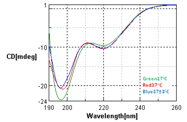 Fig. 6: CD spectra of short ELP at selected temperatures namely, room temperature, 270C, physiological temperature, 370C and ITT and physical transition temperature, 400C at a concentration of 100 µm in PBS at pH 7.2