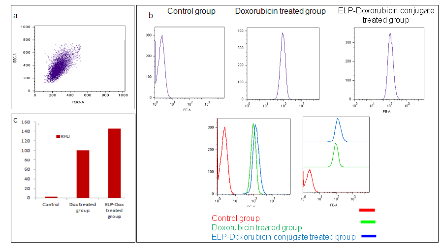 Fig. 8: a. Total cell population b. Flow cytometry histograms showing the relative fluorescence of BMG-1 cells after free drug, Dox and ELP-Dox conjugate treatment at 370C. c. Total cellular uptake of drug treated and ELP-Dox conjugate treated group as expressed in RFU