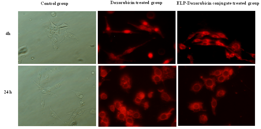 In order to demonstrate the intracellular distribution of the fluorescent Dox and the ELP-Dox conjugate, BMG-1 cells were first grown on sterile glass cover slips in petridish (5X106cells/dish). After 24 h, the cells were washed with serum free medium, treated separately with 100 µm of Dox and the ELP-Dox conjugate (prepared in DMEM serum free medium prior to use) and incubated at 370C. At the end of the treatment, the cells were washed with PBS and examined under confocal fluorescence microscope and the images were captured using 40X objective.