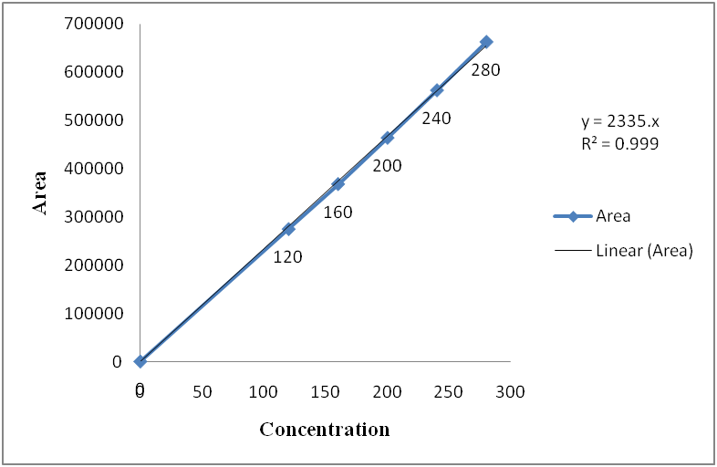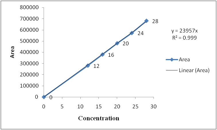 Linearity was evaluated by visual inspection of plot of peak are as a function of analyte concentrations for Metolazone and Spironolactone. From the linearity studies the specified range was determined for Metolazone and Spironolactone given as 12 - 28 μg/ml and 120-280 respectively. The results are reported in Table-1. The calibration curves are shown in (Fig.4 & 5).