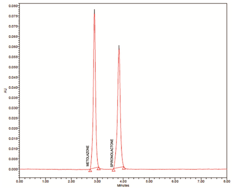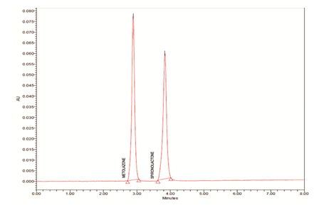 Metalactone tablets containing 5mg metolazone and 50mg spironolactone were weighed and the average weight was calculated. The tablets were powdered in a mortar and a sample of powder equivalent to 5mg metolazone and 50mg spiranolactone was transferred into a 50 ml volumetric flask and 15 ml of diluent was added, sonicated for 30 min and made up to the mark with diluents. Pipette out 5 ml of above solution into 25 ml volumetric flask and made up with diluents to obtain a concentration of 20 µg/ml, 200 µg/ml of Metolazone and spironolactone respectively.