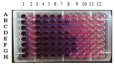 Fig. 5: MIC of the Extracellular extract of EF6 (Fusarium sp.1) by resazurin dye reduction method (column represents concentration: 1-positive control, 2-Negative control, 3-1000 µg/ml, 4-500 µg/ml, 5-250 µg/ml, 6-125 µg/ml, 7-62.5 µg/ml, 8-31.25 µg/ml, 9-15.625 µg/ml, 10-7.8125 µg/ml, 11-3.906 µg/ml, 12-1.953 µg/ml) and Row represents pathogenic strains, A=Klebsiella pneumoniae (MTCC-452), B= Pseudomonas aeruginosa (MTCC-424), C= Sphingomonas paucimobilis (MTCC-6363), D= E. coli (MTCC-443), E = Bacillus subtilis (MTCC-441), F=Streptococcus pyogens (MTCC-2327), G=Staphylococcus aureus (MTCC-3160), H=Bacillus pumilus (MTCC-432)