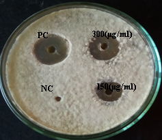 Well diffusion method was used to determine the antimicrobial activity of Endophytic fungal extract by the modifications of Clinical Laboratory Standards Institute [19-21] guidelines outlined by [22]. Petri dishes were prepared by pouring 20 ml of sterilized media (NA for bacteria and PDA for fungi) under the aseptic condition and allowed to solidify. After solidification of the media, 100 μl of standardized microbial inocula as per, Clinical Laboratory Standards Institute [13], was inoculated using sterile cotton swabs. Well was made using sterile cork borer (6 mm), 20 μl of endophytic fungal ethyl acetate extract at different concentration 200 μg/ml to 50 μg/ml for bacterial cultures and 300 μg/ml to 150 μg/ml for fungal cultures from the stock solution with the concentration of 1 mg/ml (For extracellular endophytic fungal extract) were inoculated. In other wells, supplements of DMSO and reference antimicrobial drug (Chloramphenicol) were used as negative and positive controls, respectively. The experiments were carried out in triplicate and plates were incubated at 37°C for 24 hr. After the incubation period, the diameters of zone of inhibition were measured around discs in mm as per Clinical Laboratory Standards Institute [23-24]. Each disk diffusion assay was performed in triplicates and mean diameters were recorded.