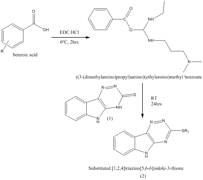 Substituted benzoic acid (0.01 mol) and 1-Ethyl-3-(3-dimethyl-aminopropyl) carbodiimide (EDC. HCl) was taken in 100 ml round bottom flask containing N-N dimethylformamide (DMF) as a solvent and the reaction mixture was then agitated for 2 h at 0 °C. Later, on the completion of 2 h the crude product (reaction step I (1)) was added (0.01 mol). The reaction mixture was then agitated at room temperature for 24 h. The reaction mixture was extracted with ethyl acetate (EtOAc), was filtered, dried and recrystallized with chloroform.