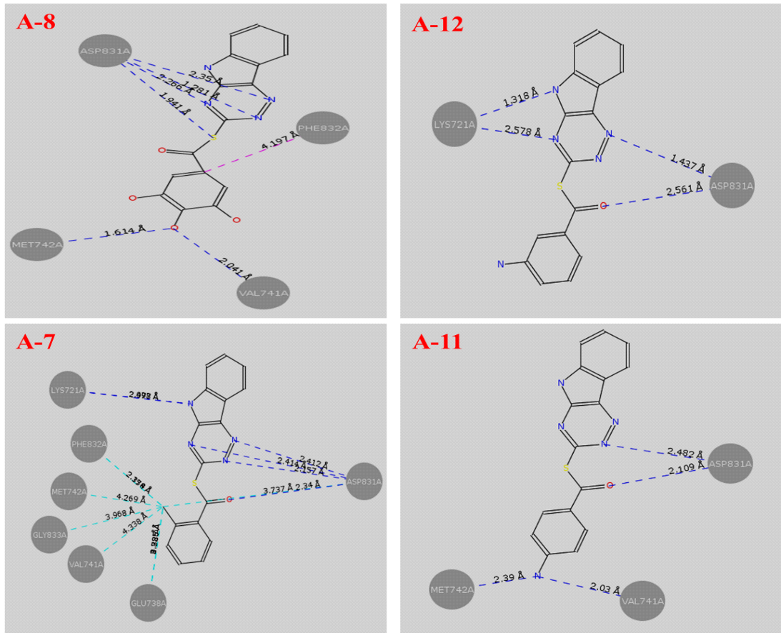 To investigate the interaction between epidermal growth factor receptor (EGFR) and synthesized derivatives; molecular docking study was carried out. Active compound MA-8 binds with ASP813A and VAL741A; MA-12 binds with ASP8134A, HIS811A and PHE832A; MA-13 binds with ASP8134A and PHE832A; MA-14 binds with ASP813A and LYS721A amino acids. Interaction of compounds with the crystal structure of epidermal growth factor receptor (EGFR) is shown in the fig. 1.