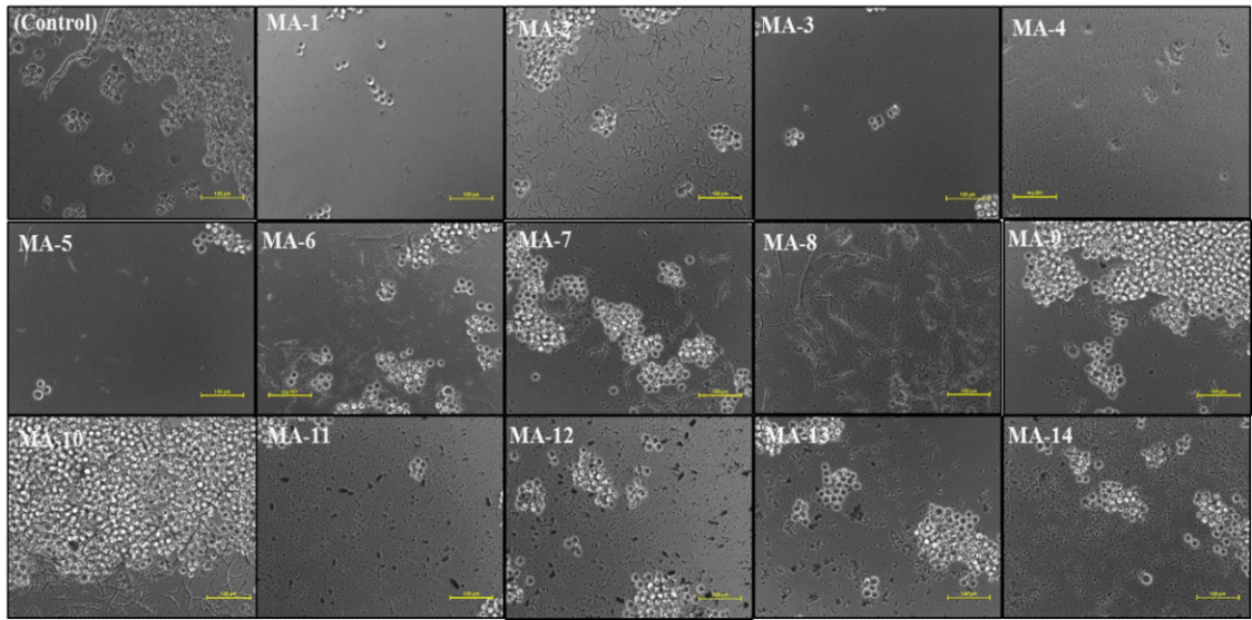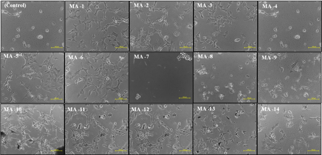 Fig. 2: Phase contrast images of MCF-7 cells showing morphological changes following the treatment with synthesized compounds