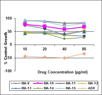 The newly synthesized conjugates bearing various substituents on the triazine ring were screened for their cytotoxicity on two cell lines namely breast cancer (MCF-7) and leukaemia (K-562) cell lines using SRB assay; Adriamycin was used as the positive control. The results of cytotoxic activity against cell lines are represented in table 1and table 2. GI50 values for standard and test compounds are depicted in the table 3. Compounds MA-12 (GI50 =<10 µg/ml), MA-13 (GI50 =<10 µg/ml) and MA-14 (GI50 =<10 µg/ml) were found to be the most active compounds against the breast cancer cell line and compound MA-4 (GI50 = 10.4 µg/ml) showed the mild anticancer activity against the Adriamycin (positive control) as shown in fig. 2 and fig. 3.