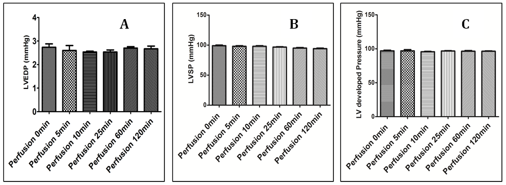 Heart rate, end diastolic pressure, peak systolic pressure, -dp/dt and +dp/dt was measured in all groups and found to be insignificantly changed in rat hearts of different groups (Figure 1).