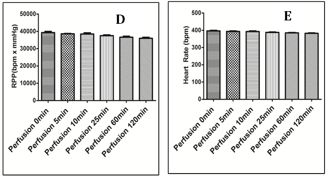 Fig. 1: Summary of hemodynamic data from the isolated heart perfusion. (A) LVEDP (B) LVSP (C)LVDP (D) RPP (E) Heart rate