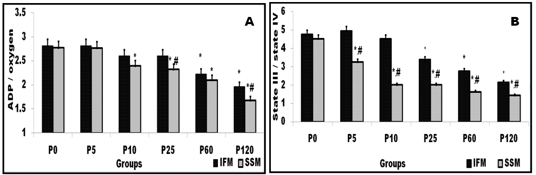 According to Lesnefsky [26], heart IFM oxidizes substrate at higher rate than heart SSM. Agreement to these findings higher complex I and V activity in IFM than SSM (fig 3) were observed in our study. Preston and his co-workers [27] found selective decline induced by ageing in activities of oxidative phosphorylation complexes I and V within a broader transcriptional down regulation of mitochondrial genes, providing a substrate for reduced energetic efficiency associated with senescence. Hence reduced activity of complex I and V in both IFM and SSM in the present study cannot ruled out the possibility of adaptation of mitochondria for reduced energetic upon long period of perfusion. That may probably influence mitochondrial respiration rate. So similar oxygen consumption rate and ADP/O ratio in IFM and SSM (Fig 2) emphasizes that there could be the direct correlation of mitochondrial physiological and functional enzymatic activities between the mitochondrial subpopulations, influencing the overall function of mitochondria.