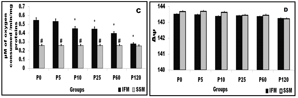 Objective: Obvious lack of interfibrillar mitochondria (IFM) subpopulation in isolated mitochondria attributed to limitations in the isolation procedure. In this manuscript, we compared the functional activities of mitochondrial sub-populations namely, IFM and sub-sarcolemmal (SSM) mitochondria.