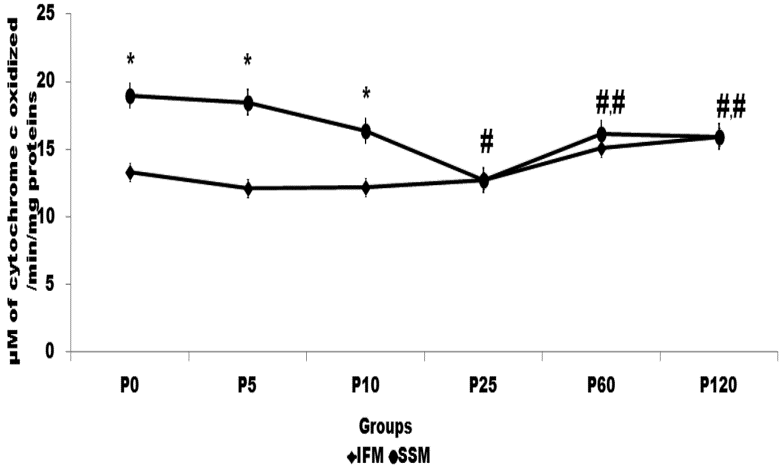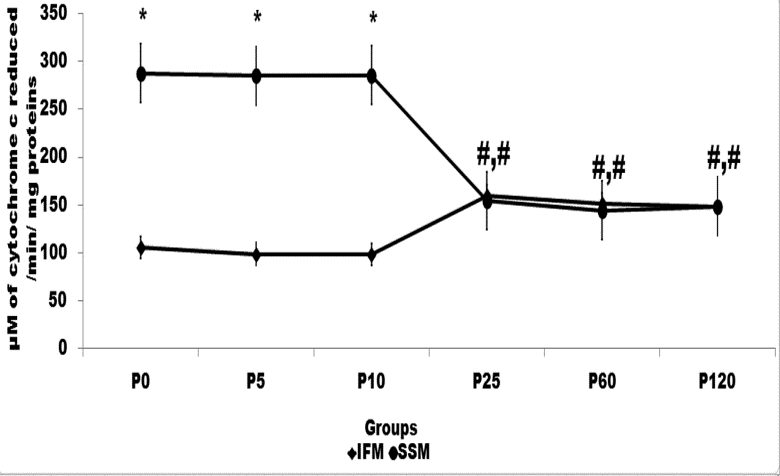 Cytochrome c oxidase, the terminal enzyme of the mitochondrial respiratory chain serves as an important regulatory site of mitochondrial oxidative phosphorylation, showed similar activity in both SSM and IFM beyond 10 minutes of perfusion(fig 3d),predicted probable coordinate function of subpopulation. Relatively COX activity was more or less constant in IFM throughout the perfusion, but higher variation was observed in SSM, indicate vulnerable state of SSM from isolated rat heart (fig 3d), confirmed by low rate of oxidative phosphorylation in SSM as compared to IFM (Fig 2).