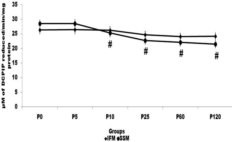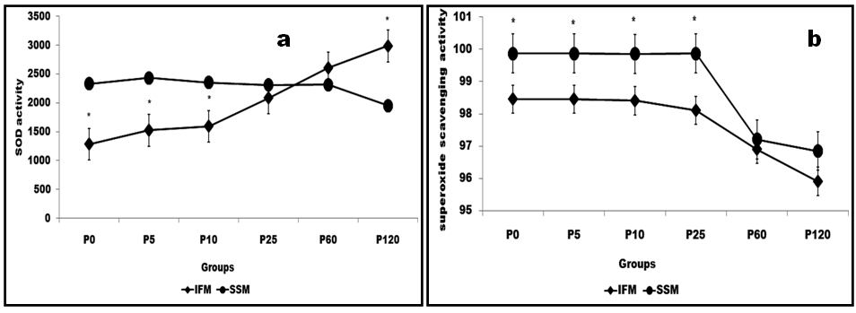 The detection of superoxide scavenging activity was done by the reduction of nitroblue tetrazolium, trolex (1-10µg/ml) was used as standard. Both IFM and SSM showed reduced superoxide anion scavenging activity towards the end of prolonged perfusion; indicate possible accumulation of superoxide anion (fig 4b). Early phase of perfusion showed relatively higher superoxide anion scavenging activity in SSM.
