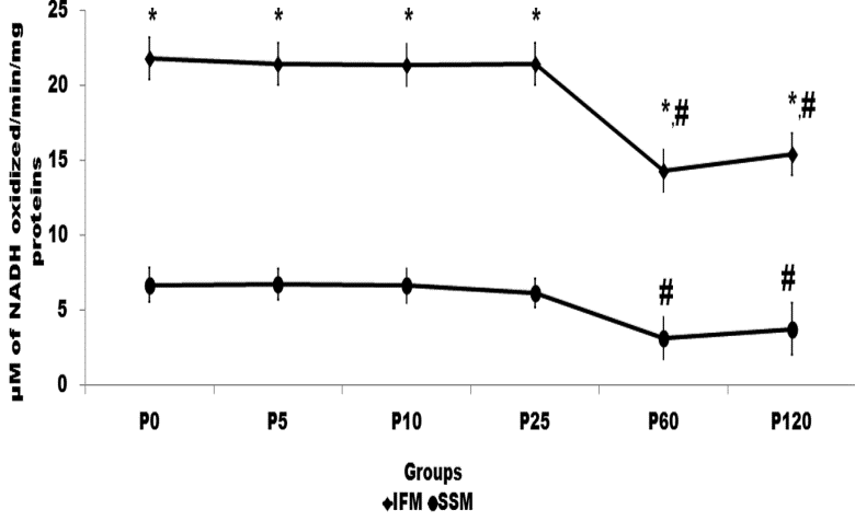 Evidence from the literature suggest that under pathological conditions, electron transport chain complex activities in IFM and SSM varied where IFM seems to be more vulnerable for the oxidative stress [28]. We also found a similar result in IFM, where complex I activity was significantly declined (Fig 3a) than SSM subjected to prolonged perfusion. Based on our results, we think that rate of electron flow is higher in IFM, account to its higher oxidative rate reported by other [12], in the initial periods of perfusion and get deteriorated as the period of time increased.