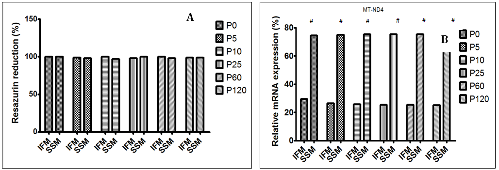 Fig. 5: Mitochondrial metabolic activity by resazurin reduction assay and relative mRNA expression (a) Rezasurin assay (b) MT-ND4, (c) MT-CYT B, (d) MT-ATP 6
