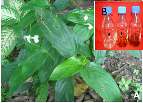 Fig. 1: (A) Habit of M. arundinacea (B) Visual observation a) AgNO3 b) leaf extract c) leaf extract+AgNO3