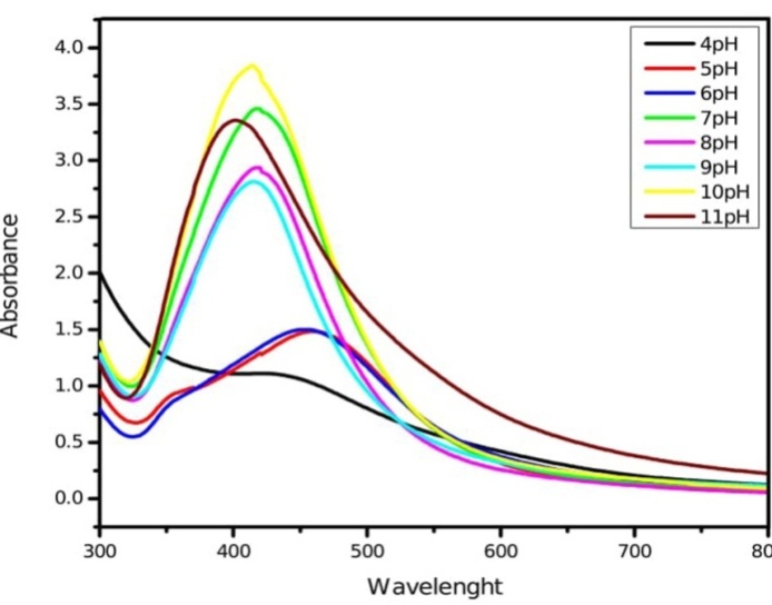 Fig. 2: UV-Vis absorption spectra of silver nanoparticles synthesized by leaf extract of M. arundinacea at different pH
