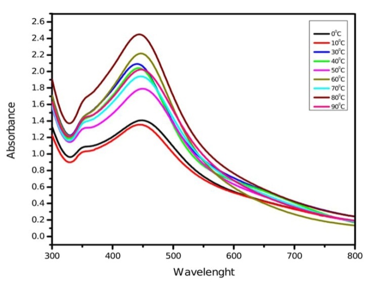Fig. 3: UV-Vis absorption spectra of silver nanoparticles synthesized by leaf extract of M. arundinacea at different temperatures