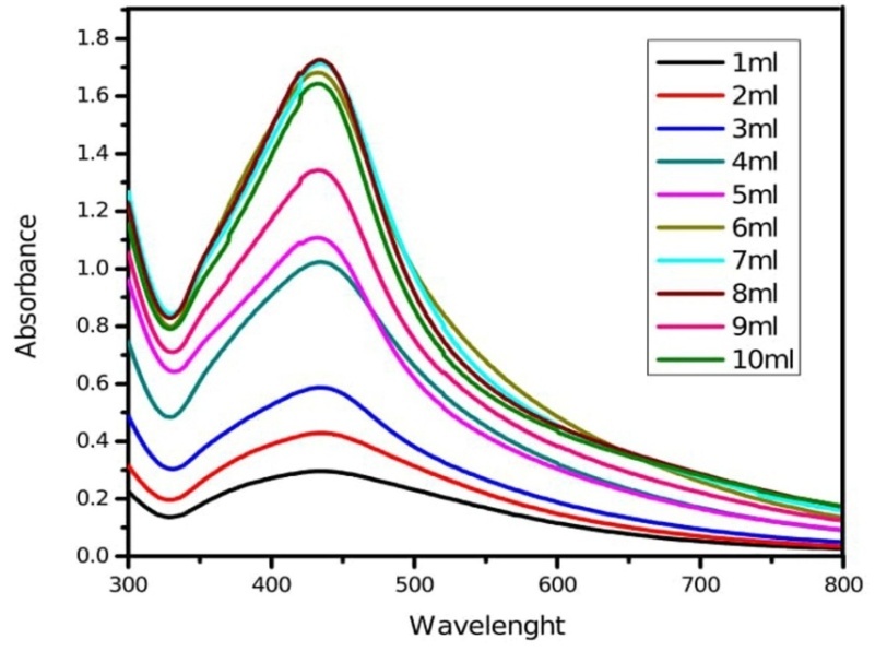 The quantity of leaf extract plays an important role in the complete conversion of silver ions into silver nanoparticles. Fig. 4 depicts a series of absorption spectra recorded from the solution of silver nanoparticles at different leaf extract concentrations of experimental plants. The optimum condition for the synthesis of silver nanoparticles is 8 ml (fig. 4). The sharpness of the absorption peak is dependent on the quantity of leaf and fruit extract, which gets sharpened at higher quantity up to a certain limit further, increase in quantity showed broader absorption peak. Increase in the leaf extract quantity decreases the size of silver nanoparticles [40].