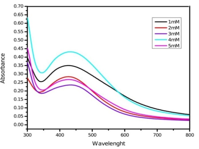 The reaction was monitored by using different concentration of silver nitrate (1, 2, 3, 4 and 5 mmol) solution for the synthesis of nanoparticles.