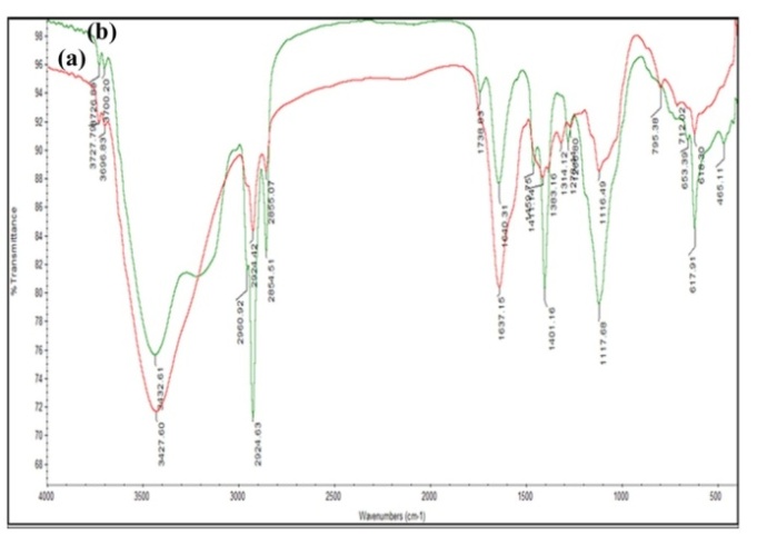 Fig. 6: FTIR spectra of silver nanoparticles synthesized by leaf extract of M. arundinacea (a) leaf extract (b) silver nanoparticles solution