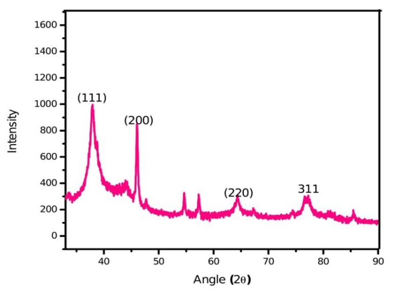 It is a very powerful and versatile quantitative technique to elucidate the complete three-dimensional structure of matter at molecular and atomic levels. Elucidation of detail structural features at atomic levels is possible if the specimen is in a crystalline state. The diffraction intensities were recorded from 30օ to 90օ at 2θ. The XRD pattern of M. arundinacea silver nanoparticles synthesized by leaf extract showed four diffraction peaks 37.86օ, 44.04օ, 64.13օ, 76.98օ 19օ corresponding to (111), (200), (220) and (311) planes respectively (fig. 7). All the peaks in XRD pattern can be readily indexed to a face-centered cubic structure of silver as per database of Joint committee on powder diffraction standards (JCPDS) (file number 893722/04-0783). It confirms the FCC crystalline nature of elemental silver and shape of nanoparticles are spherical and hexagonal. The Bragg angle which gives the mean size of 8.96 nm of leaf extract of silver nanoparticles synthesized by M. arundinacea.