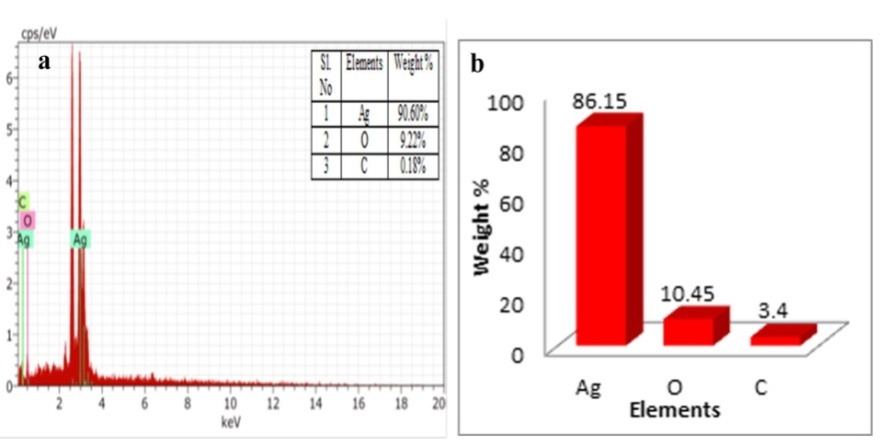 Fig. 8: a) EDX spectrum b) quantitative analysis of biosynthesized silver nanoparticles by using leaf extract of M. arundinacea