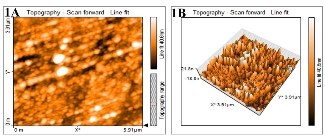Fig. 9: AFM images of silver nanoparticles synthesized by leaf extract of M. arundinacea (1A) Two-dimensional image (1B)-Three-dimensional images