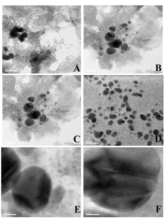 Fig. 10: HR-TEM Images of silver nanoparticles synthesized by leaf extract of M. arundinacea (A-0.1 µm, B-100 nm, C-50 nm, D-20 nm, E-10 nm, F-5 nm)