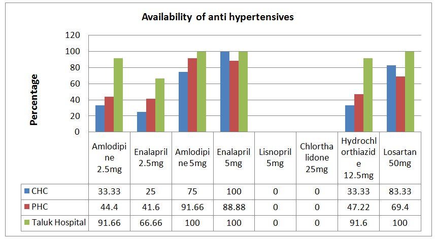 Figure one, Contains the detail of availability of selected antihypertensive drugs by Gov. of Kerala (Treatment Protocol) at one CHC, three primary health care facility and one Taluk Hospital of four survey area. All the drugs listed were available in private pharmacies.