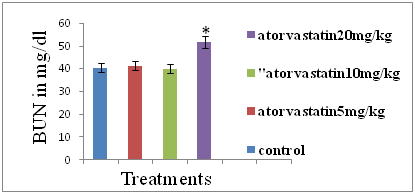 The Blood Urea Nitrogen (BUN) is an indicator of renal function; was measured for all groups. BUN of control animals was found to be 40.467±0.715mg/dl. Atorvastatin5mg/kg treated group exhibited a BUN value of 41.283±0.825mg/dl which was not significantly different from ontrol animals. Atorvastatin treatment at a dose of 10mg/kg gave a BUN value of 40.069±0.946mg/dl (p=0.988) as compared to control treatment. The treatment with atorvastatin 20mg/kg treatment increased BUN level to 51.783 ±1.015 which was significantly higher when compared with control group animals. Data shown in figure1.