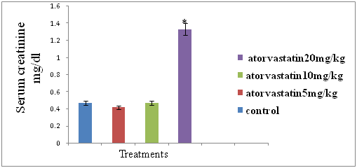Serum creatinine is another important indicator of renal function and is increased in impaired kidney function. Serum creatinine concentration in control group of animals was 0.467±0.033mg/dl. Treatment with atorvastatin5mg/kg and 10mg/kg caused a serum creatinine level of 0.417±0307 (p=0.705) and 0.453±0.0453 (p=1) respectively as compared to control group which was not statistically significant. The treatment with atorvastatin 20mg/kg treatment increased serum creatinine to 1.333±0.033significantly (p=0.0001) as compared to the control group. Data shown in fig 2.