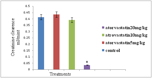 Creatinine clearance is also an index of renal functions and decreased clearance may be associated with decline in renal functions. In our study creatinine clearance did not changes significantly in rats treated with low doses of atorvastatin compared to the control animals. But atorvastatin at a dose of 20mg/kg caused a significant fall in creatinine clearance as compared to the control and this fall in creatinine clearance is in agree with the report that a high dose statin was associated with decline in renal functions.