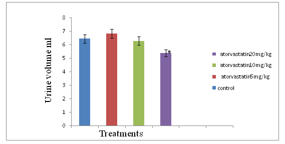 Urine output give an indirect indication of renal function.24 hr urine volume was measured at the end of the study in all groups of animals. The control group animals on 7th day gave urine output of (6.43 ± 0.23) ml. The treatment with atorvastatin 5mg/kg and atorvastatin 10mg/kg resulted in a urine output of 6.82±0.28 ml (p=0. 637) and 6.27 ±0.23 ml (p=0.954) respectively, the values were not significant when compared with control animals. But the treatment with atorvastatin 20mg/kg reduces the urine output to 5.38±0.14 and this reduction in urine volume was significant (p=0.018) when compared with control group. Data are shown in fig: 4.