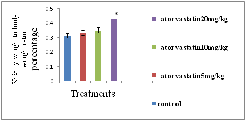 The kidney was weighed after the various treatment periods and was expressed as organ to body weight (%) ratio. The kidney weight in control group was 0.314 ±0.009. In groups treated with atorvastatin (5mg/kg) the organ to body weight ratio of kidney was found to be 0.335±0.011(P=0.710) which was not significantly different from control groups. Treatment with atorvastatin 10mg/kg causes a organ to body weight ratio of 0.351 ± 0.019(P=0.263);Which was also not significantly different from control groups. The treatment with atorvastatin 20mg/kg resulted in significant elevation of this ratio of 0.428±0.012 (P=0.001) as compared to control group. Data are shown in fig 5.