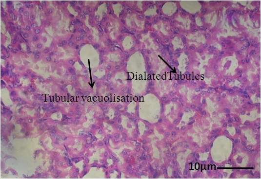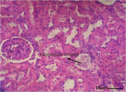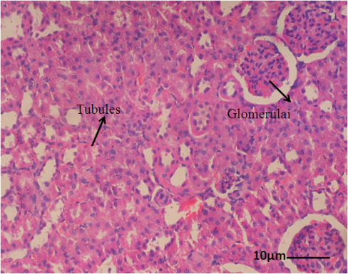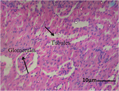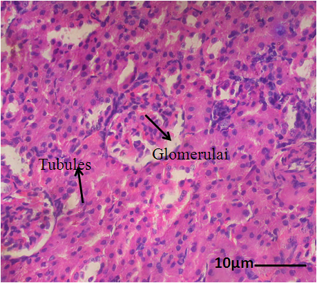 Left Kidney was fixed in 10 % neutral buffered formalin, dehydrated with alcohol and xylene, embedded in paraffin wax, sliced to 5 µm thick sections using rotary microtome, stained with haematoxylin and eosin and subjected to analysis for histological changes using microscope.