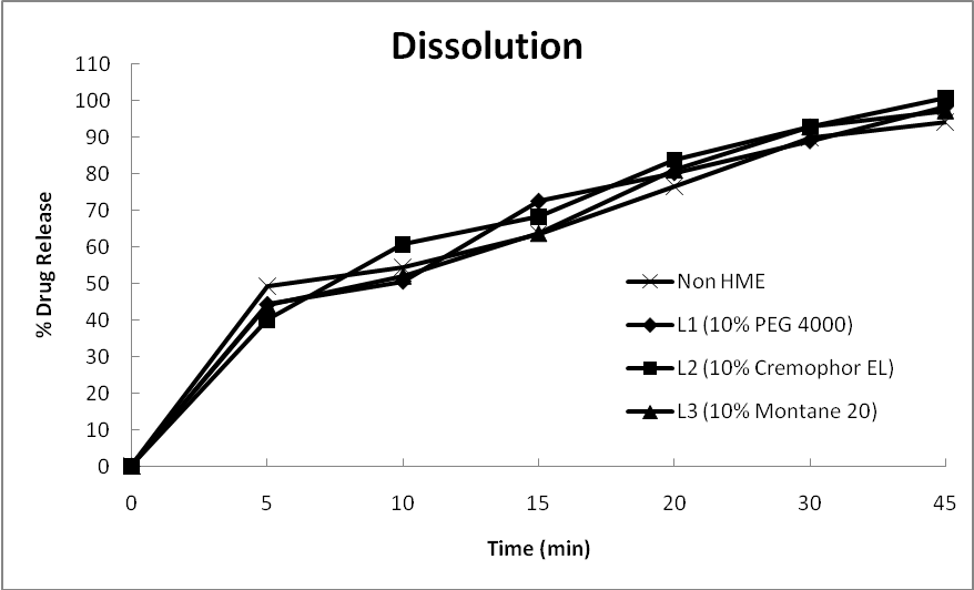 The disintegration time (DT) of these tablets was two times more than DT of NHME formulation. At first time point dissolution of HME formulations was slower than NHME formulations, due to higher DT of tablets, thereafter both approaches shows similar dissolution profiles.