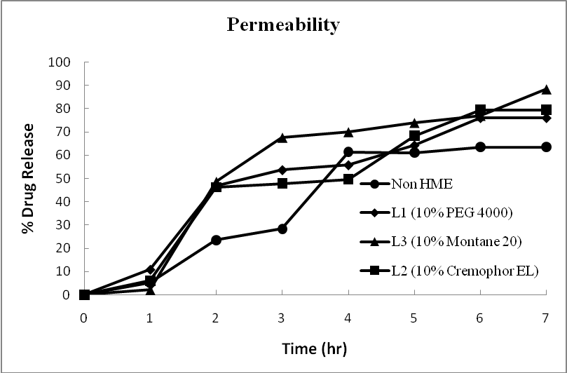 Results: Drug release showed the similar profile for all the HME formulations while the permeability studies showed improved permeability of formulations containing Montane 20PHA. In comparison to Non HME, HME formulations showed a significant enhancement in permeability. SD prepared by Cremophor EL resulted in 765.22% enhancement in extent of absorption.