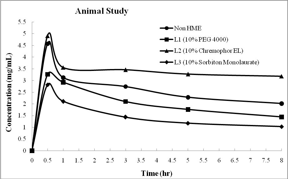 All the pharmacokinetics parameters namely Cmax, Tmax and (AUC)0-∞ indicated rapid and higher absorption of Lamo when administered as solid dispersion (L2) prepared using 10% Cremophor EL. AUC0-∞ was also much higher in case of SD prepared with 10% Cremophor EL when compared to NHME and other HME formulations. AUC0-∞ was increased from 23 hr*µM (for pure drug) to 30 hr*µM, 199 hr*µM and 44 hr*µM for L1, L2 and L3 respectively. Extent of absorption was increased by 30.43%, 765.22% and 91.30% in L1, L2 and L3 formulations respectively. Noticeable boost in absorption of L2 formulation was observed due to p-gp inhibition activity by Cremophor EL. Lamo is a strong substrate of P-gp activity, so P-gp inhibitor like Cremophor EL enhanced its in vivo bioavailability to great extent. As a measure of hydroxyl groups in a surfactant, the hydroxyl value is an indicator of the hydrophilic character [21]. In this study, it has been observed that solubility of drug increases as hydroxyl value increases. In, in vivo study the extent of absorption increases as hydroxyl value of plasticizers increases. Plasticizers like Montane 20 PHA and PEG 4000 improved the solubility and permeability of Lamo as compare to pure drug due to HME technology. The bioavailability enhancement of Lamo in L2 formulation is a cumulative effect of HME technology and P-gp activity of Cremophor EL. So it is difficult to calculate the exact improvement in bioavailability due to HME technology.