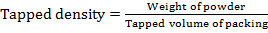 After the initial volume was observed, the cylinder was allowed to fall under its own weight onto a hard surface from the height of 2.5 cm at 2 Sec intervals. The taping was continued until no further change in volume was noted [15].