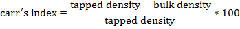 The compressibility index of the granules was determined by the Carr’s compressibility index. (%) Carr’s Index can be calculated by using the following formula [15].