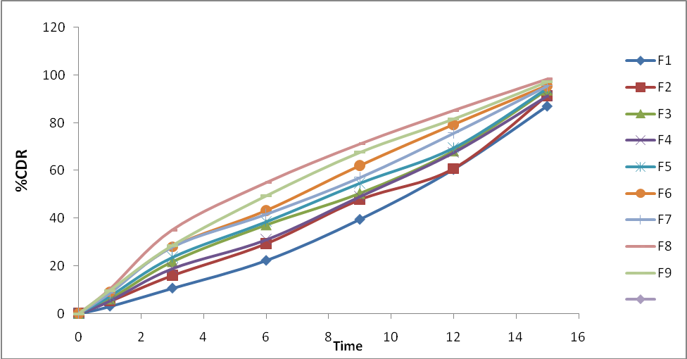 % cumulative drug release was found in the range of 87.12±0.599 to 98.5±0.567 %.