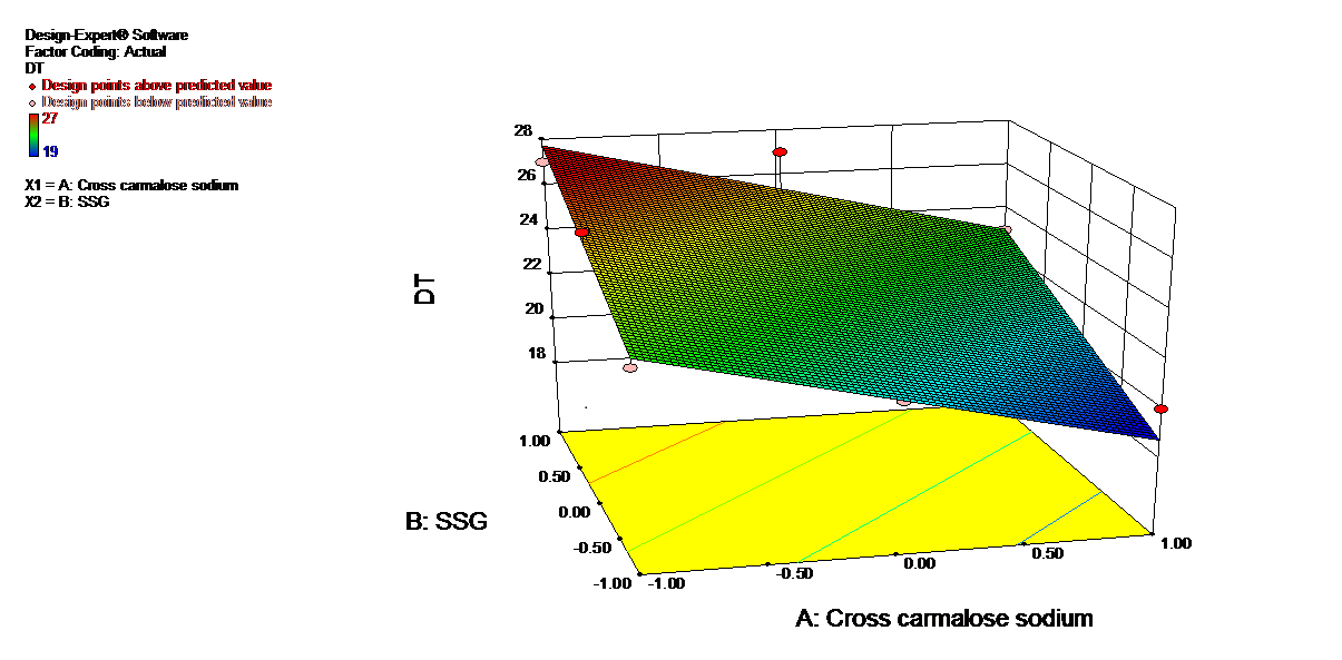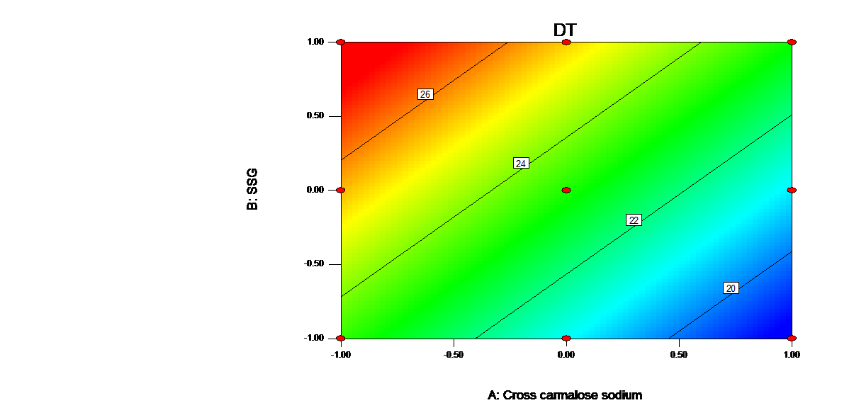 In case of in vitro drug release, the three-dimensional surface response plot depicted the increase in the drug release and disintegration time as increasing the concentration of superdisintegrants. The two-dimensional countour plot relating X1X2 (interaction between croscarmellose sodium and sodium starch glycolate) was nonlinear indicating interaction between two variables.